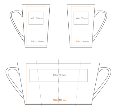 Auf dem Tassengriff (60x10 mm) Auf der Innenwand (50x10 mm) Aufdruck von unten (ø40 mm) Druck über den Rand Handarbeit - Einfärbung des Randes Personalisierung Personalisierung Graveur |